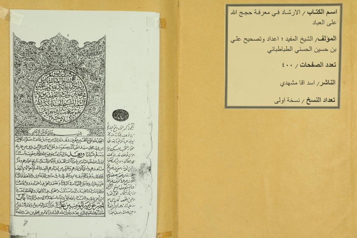 الكتاب الذي نستعرضه بين ايديكم هو ليس غريبا على رواد المطالعة والباحثين بل حضي بالصدارة كما هي الصدارة لمؤلفه في نفوس المخالفين قبل الموافقين الا وهو الشيخ العكبري البغدادي الملقب بالشيخ المفيد وكتابه : (الارشاد في معرفة حجج الله على العباد) الذي رسم صورة التعامل العلمي الصحيح مع التاريخ باعتماده على المنهج العقائدي الذي رسمه رسول الله (صلى الله عليه وآله) الى هذه الامة، تجدها وتلتمسها من خلال المطالعة لكتابه (الارشاد) وما يحمل من خصوصيات قد اضيفت الى خصوصياته التي امتاز بها على الكثير من النسخ، وتمتلك مكتبة الروضه الحيدرية المقدسة نسخة مميزة لتضمنها حاشية مهمة جدا كتبها السيد علي بن المولى الحاج ميرزا حسين الحسيني الطباطبائي، ولم تذكر كل النسخ التي طبعت حديثا وحتى التي حققت بجودة واتقان هذه الحاشية القيمة بل حتى الاشارة لها، على الرغم ان هذه الحاشية اشار فيها السيد الطباطبائي انه اعتمد على كتب اللغة وكتب الرجال والحديث كإشارة وتأكيد وتأييد للاحاديث والنصوص الواردة في هذا الكتاب .