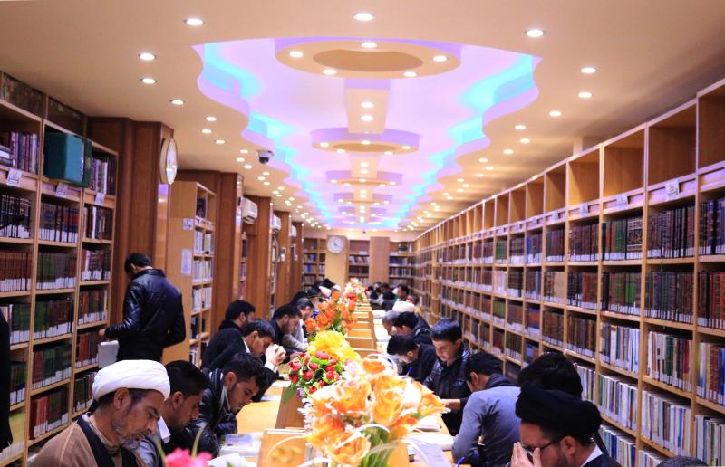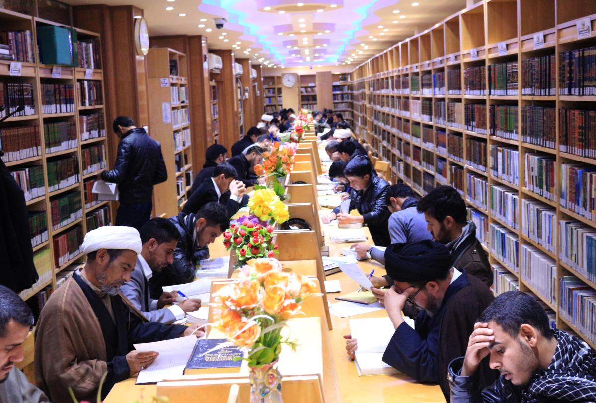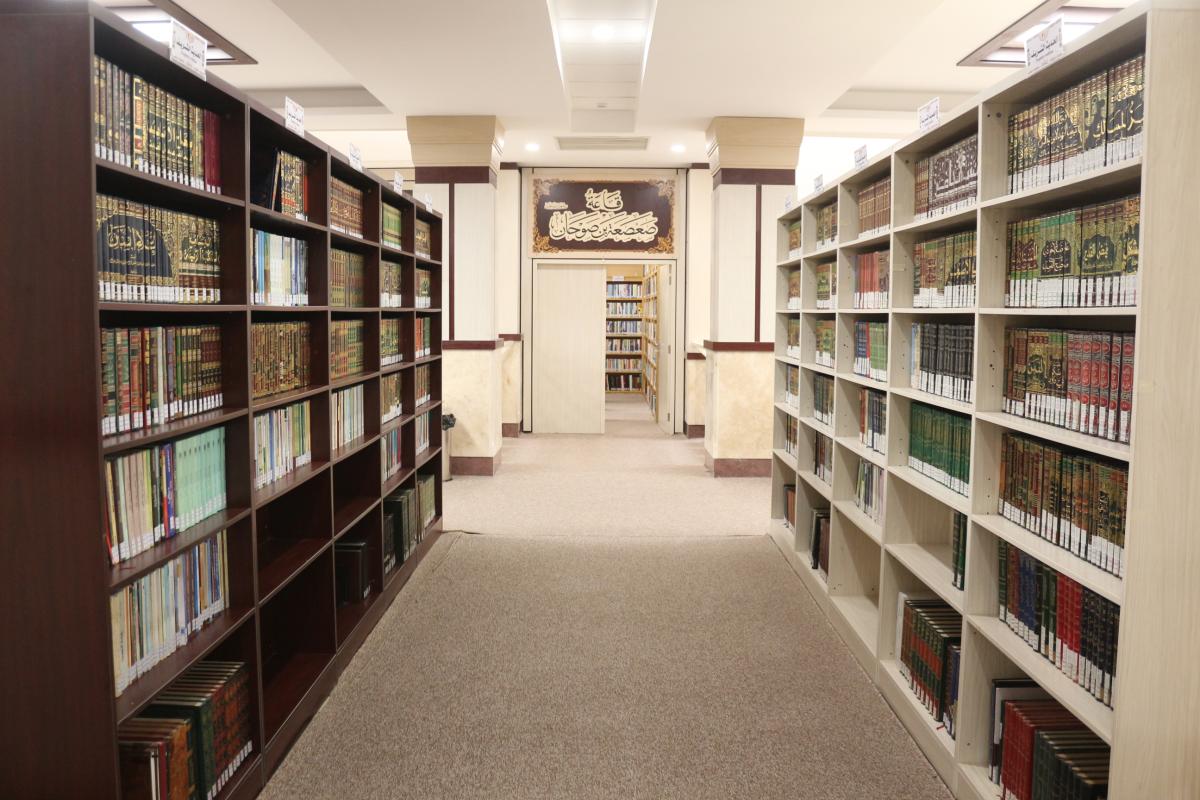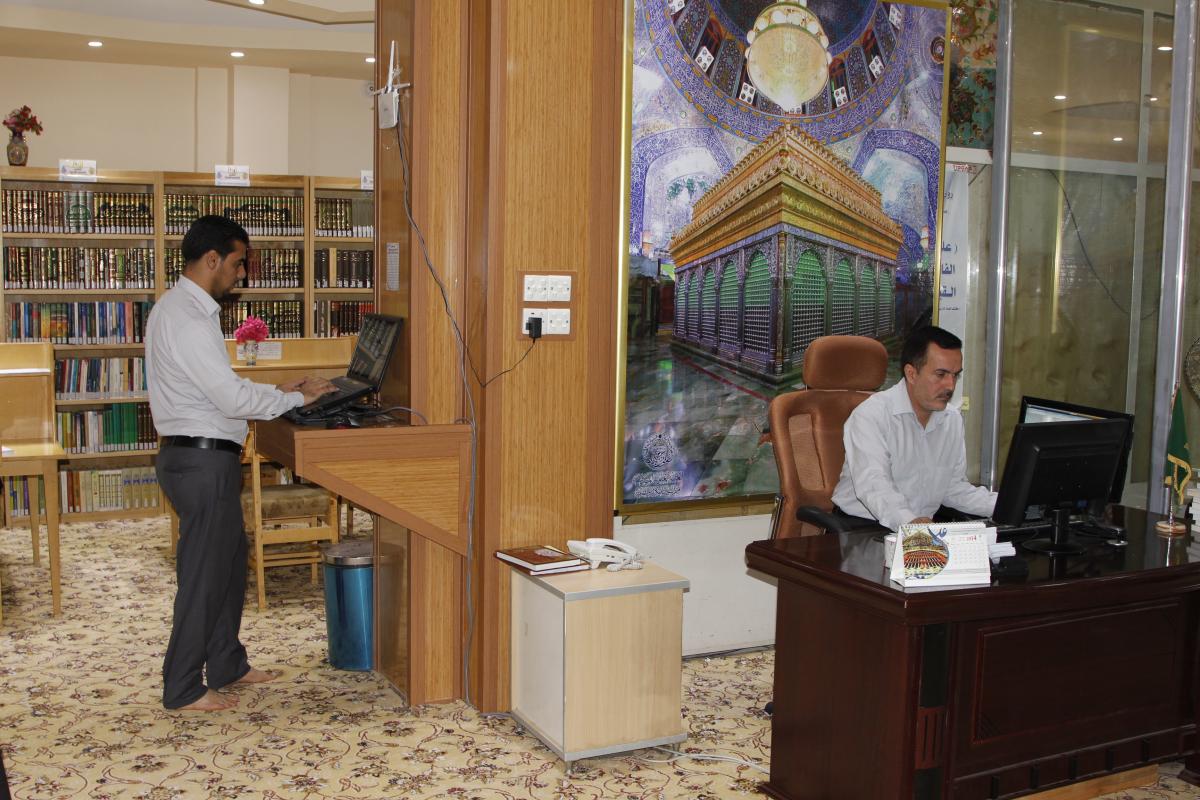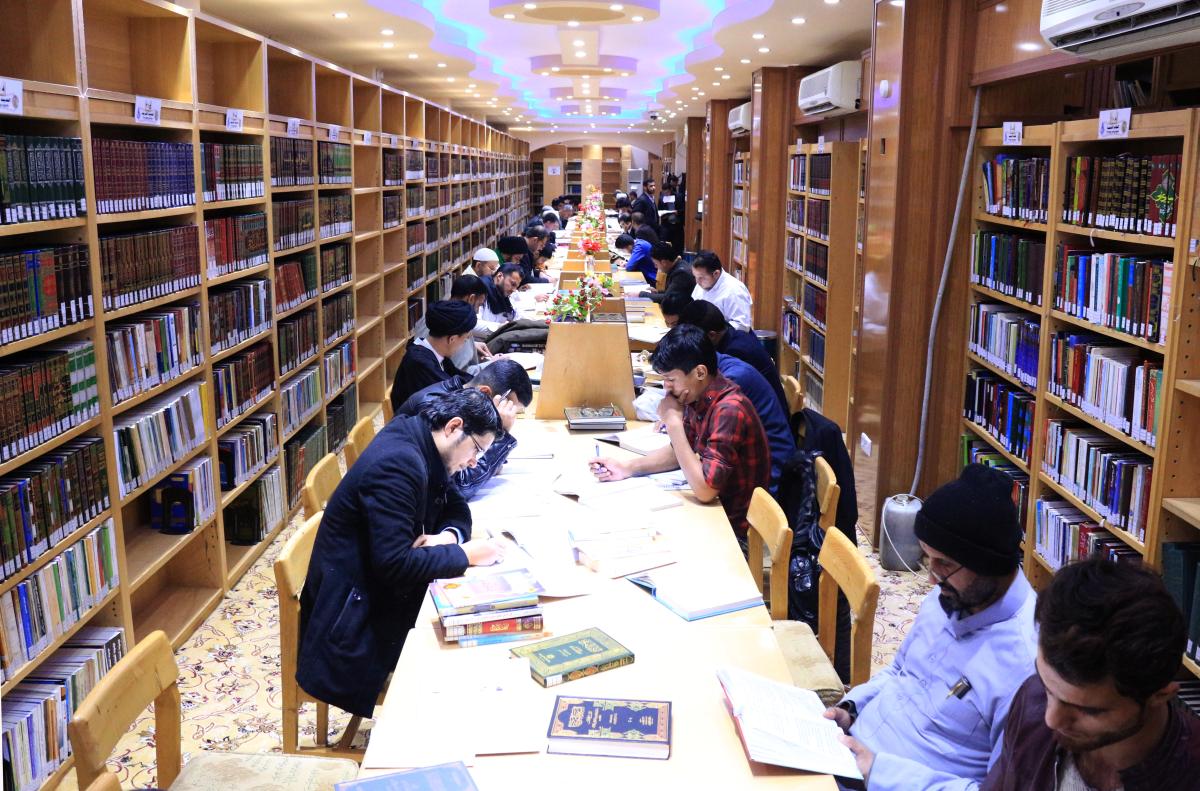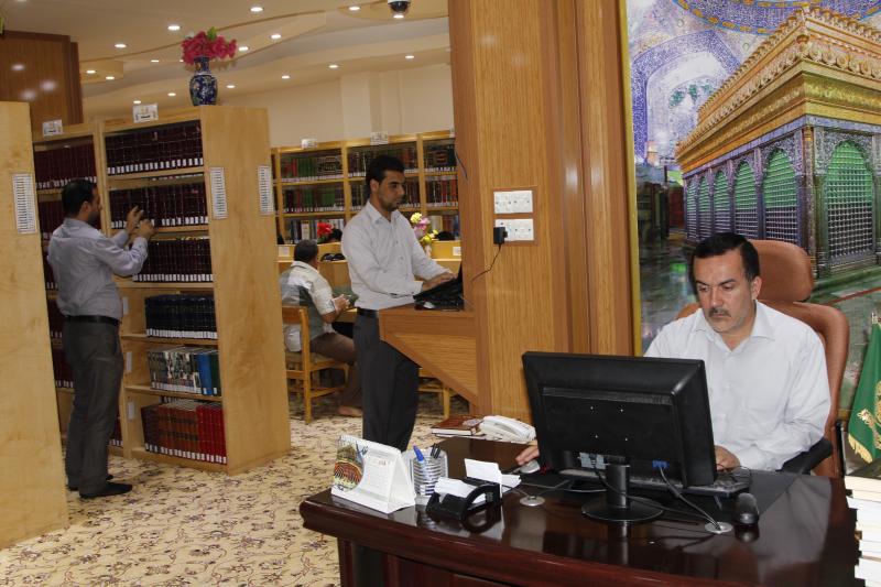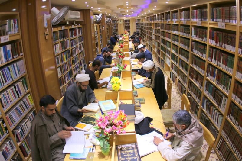 وهي على نحو الرفوف المفتوحة، حيث يكون الكتاب أمام القارئ والباحث مباشرةً ممّا يساعد على سهولة البحث و الاطلاع على الكتب والمصادر الموجودة داخل القاعة - كما أن كتبها رُتِّبَت حسب التصنيف الموضوعي - كالتفسير والمباحث القرآنية، والحديث الشريف، والرجال والتراجم وغيرها من موضوعات المعرفة، علماً إنّ معظم كتب هذه القاعة هي باللغة العربية كما تشتمل على مجموعة من الكتب بالّلغات الأُخرى من قبيل اللغة الفارسية والاردو والانجليزية وغيرها، ويقدر عدد الكتب لكلا القاعتين (قاعة الرجال وقاعة النساء) في الوقت الحاضر (عام 1439 هـ 2018 م) بـ اكثر من (200 ألف) كتاب .